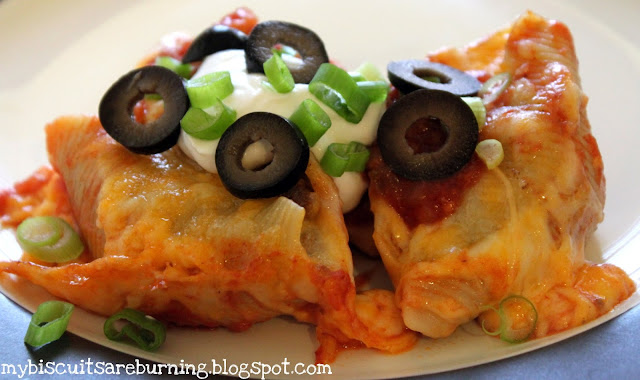 We liked these shells topped with lots of green onions, olives and sour cream. My little 4 yr. old helped me stuff the shells with the meat mixture. We decided to give this recipe 3 1/2 stars (out of 5). It was fun to try something different.